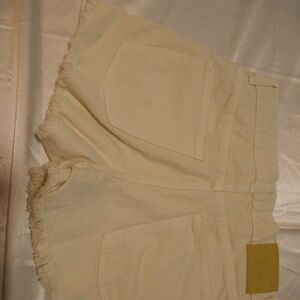 Denim shorts with interior adjustable waistband and snap button closure at the front. Front pockets and patch pockets on the back.