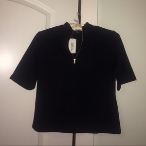A short-sleeved top cut from textured knit with a partially zipped front and a mock neckline. I've never worn it, it has the original tags. It fits really well, I just don't like the look on me.