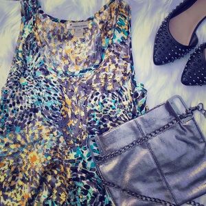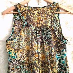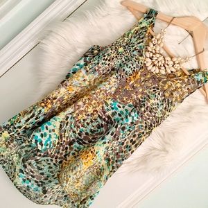 Silky-feel yet breezy and lightweight to look polished whether it's with a pencil skirt for work or with white skinny jeans for happy hour with the girls. Pattern is vibrant without being obnoxious and will go with anything! Forgiving fit and flowy cut make this top workable for sizes XS to M depending on chest size. I brought it when I was an XXS and have worn it when I've been closer to M. Perfect condition! Looks more expensive than it is and perfect for your high-low wardrobe.