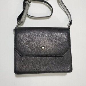 Very cool square rectangle box shaped crossbody is color block with black on the front and back and silver on the sides and bottom. Adjustable crossbody strap is also black and silver. Can remove it and use as a clutch. Flap and snap closure. Main pocket divided in half. In excellent, like new condition. I only carried this one time for a few hours. Man made PU vegan leather. Rocker chic. By MMS Design Studio. Approximately 7 x 7 x 1.75 inches.