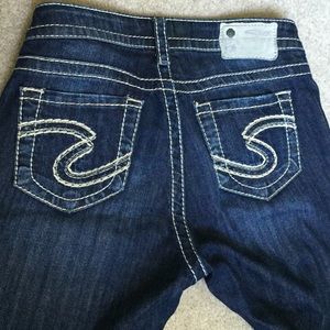 Silver jeans, dark wash, the bottom doesn't have much tearing expect for what you see in the picture. I have worn them once ! they are in very good condition