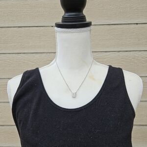 Silver tone chain necklace with a rectangular pendant with 12 clear crystals (test as glass on a Presidium gem tester). In good used condition with no known flaws. Approximately 16" with a 2" extender.