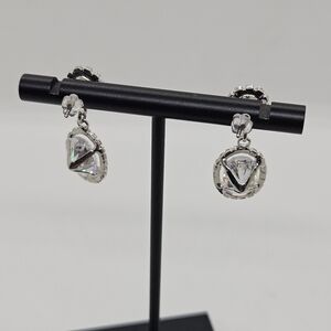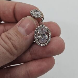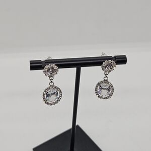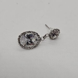 Gorgeous sparkly rhinestone earrings. Circular at the earlobe, with a dangling oval, both of which are surrounded by smaller rhinestones. In good used condition with no known flaws. Quarter shown for scale, will not be included with your order. Measures approximately 1.25" long.