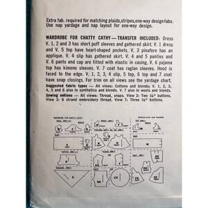 V. 6 pants and cap are fitted with elastic in casing. V. 6 pajama top has kimono sleeves. V. 7 coat has raglan sleeves. Hood is faced to the edge. V. 1, 2, 3, 4 slip, 5 top, 6 top and 7 coat have snap closings. For trim on all views see the yardage chart.