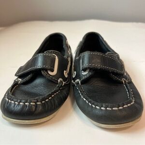 Cute old money little boys dark navy leather slip on loafer/boat shoes. Self closure for easy on/off. Cute little boys Easter shoes or great for family photos. Full leather exterior. Some wear but overall in great condition.