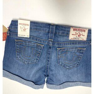 True Religion, size 26, mid rise, cut off shorts, stretch denim, True Religion shorts, True Religion shorts, denim shorts, jean shorts, designer, new, new with tags, super stretch