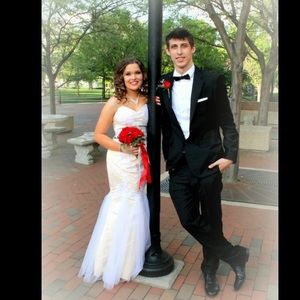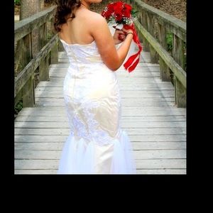 size 4 but gives you room to move! champagne and white strapless mermaid style dress! only worn for maybe 2 1/2 hours, perfect condition ! It's a beautiful dress on!