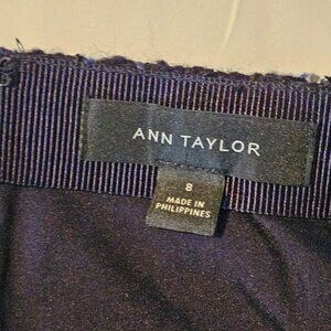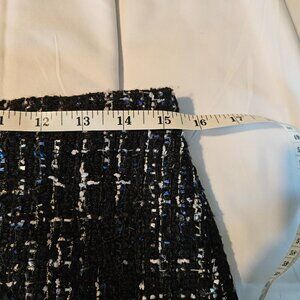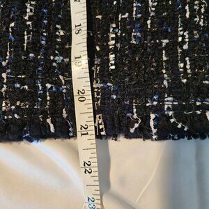 This tweed mini skirt is lightly fringed, giving it a bit of an edge. Colors: blue, black, and white.