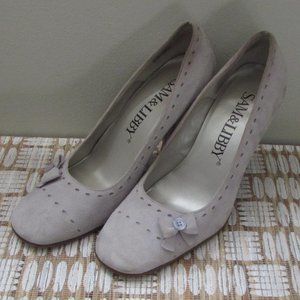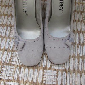 These are very cute pastel grey heels, with a bow and button. They have intention indentions in a "stitch" pattern around the toe and side. Vintage inspired suede shoes, leather upper. Gently used.