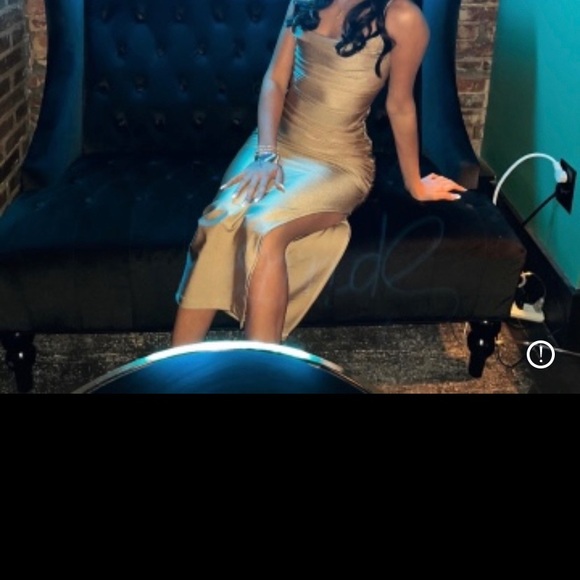 the brand of this dress is windsor and the color is gold! you can adjust the back and it has a slit on the side of dress.