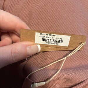 The product is a stylish and comfortable Skims bodysuit in a beautiful rose clay tan pink color. Made from a blend of soft cotton and elastane, this one-piece top is perfect for everyday wear or as a cute intimates piece. The ribbed design adds a touch of texture, while the XS size ensures a perfect fit for women looking for a trendy and comfortable option in their wardrobe.