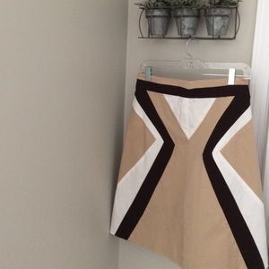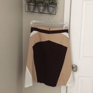 Falls right above knee. i'm 5'6. Comfortable n fitted at waist and then flares a-line. Brown/tan/white. In great condition. Worn only 3 times.