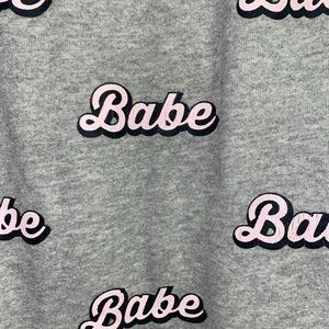Above the knee sweat pants material gray skirt with light pink n black word decoration stretchy waist
