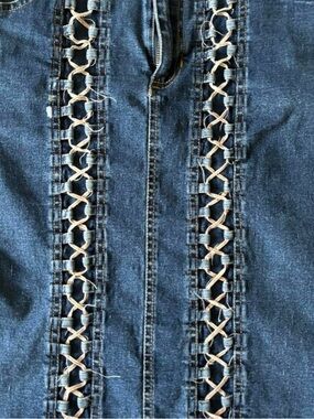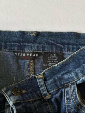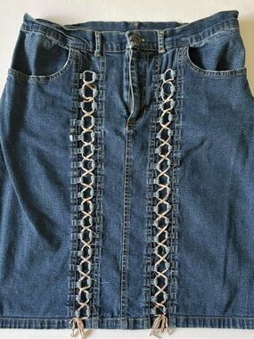 brand: starwear size: 9/10 y2k 2000s denim jean skirt. zipper not really functional, but has stretch to slip on. measurements waist: 14” length: 20”