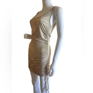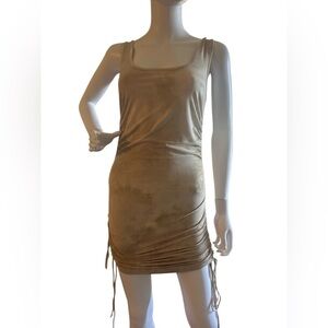 Featuring a neutral mocha tie dye print, round neckline, sleeveless, ruching throughout the bottom and adjustable strap detailing.