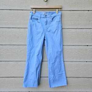 Light blue colored stretch pants with raw hem. In good used condition. Relatively straight leg cut, cropped length.
