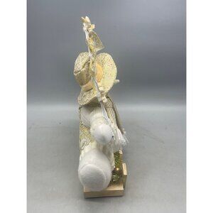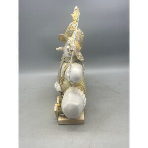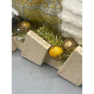 This charming snowman figurine adds a festive touch to any space. Perfect for shelves or hanging, its white and gold design with snowflakes offers versatile holiday decor. Please note: used condition with some peeling and loose strings. See photos for details.