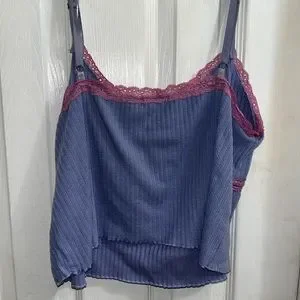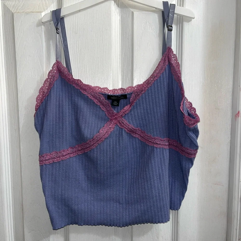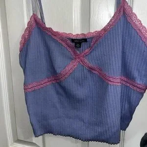 lace trim around the top, adjustable spaghetti straps, cropped tank.