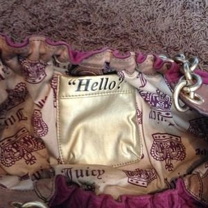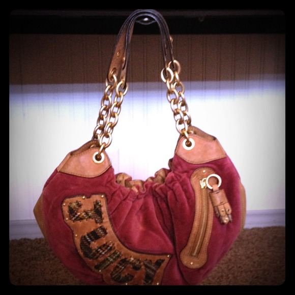 Kind of a maroonish purple hobo bag with brown leather, gold, and plaid accents. Thick gold chain link straps with leather handles. Very roomy with inside zip pocket and cell phone pouch. It also has a small outside zip pocket. It has a small black smudge on the underside but it's not visible when you hold it upright. Other than that I would say it is in great confition