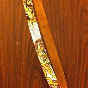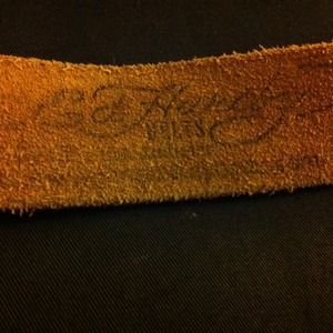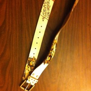 Really cute white belt with tiger designs & " Don Ed Hardy" written on it. Authentic. I'm not 100% on the size but I wear a size 3 and it fits me on the 7th hole (there are 8) so I would think it would fit up to maybe a size 9. The writing on the inside is a bit faded (showed in picture) & the one hole is a little worn but not noticeable. It's an adorable belt that looks great with any pair of jeans 😊I will negotiate prices & do bundles 😄