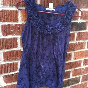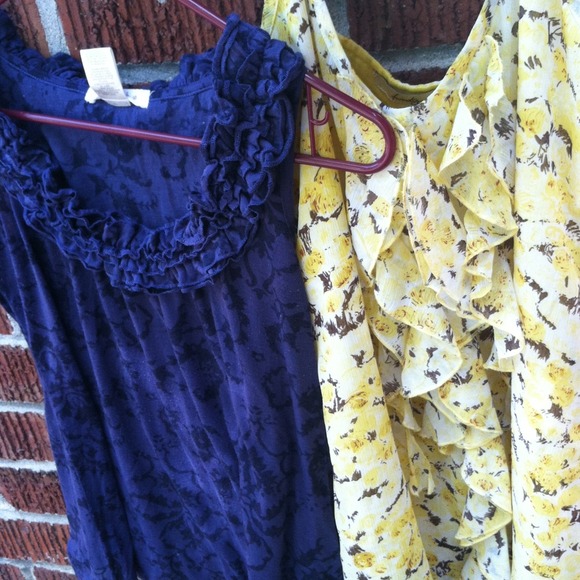 Blue sheer sleeveless with ruffle detail around neckline is small but fits a medium perfectly. Yellow ruffle top is from forever 21 and is a large. I'm a medium and wore both.