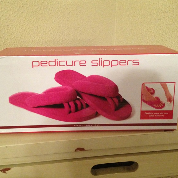 Pink slippers. Hard bottom with soft cotton top.dividers separate toes while they dry . New still in plastic sealed wrapper and box