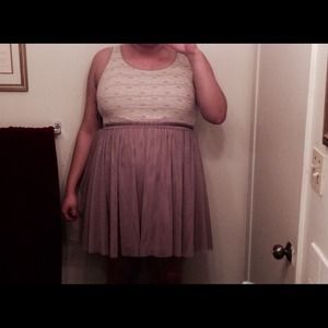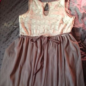Cute dress with cream colored lace on the chest and light brown/beige colored bottom. Fully lined and the bottom is like tulle. Only worn once for a wedding.