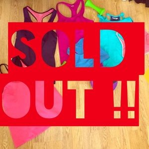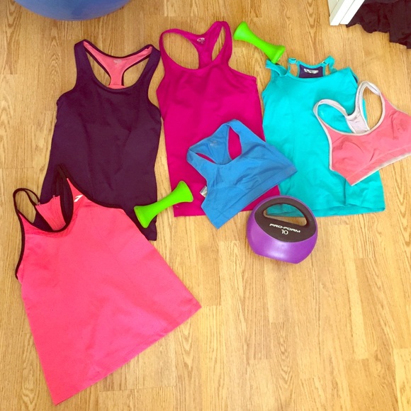 Dark purple & medium purple top(s) & blue sports bra (m) are champions those $26. Pink and black top is a really good brand I just realized its brooks and it's in amazing shape size (s) thatnone is $15 alone. I could bundle everything for $40