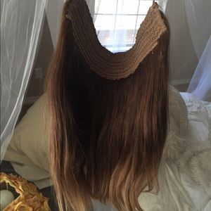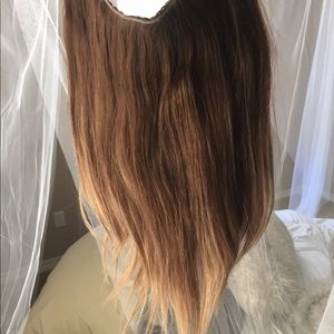 Never worn, has never had heat applied. 100% human hair extension. Super thick! 180 grams 16 in long with some slights layering for a more natural affect. Can be worn with the halo wire or have clips attached. This color just didn't quite match up with my hair. You could always have it recolored I just never got around to doing that.