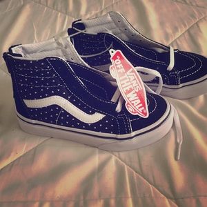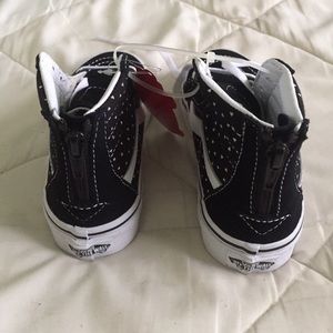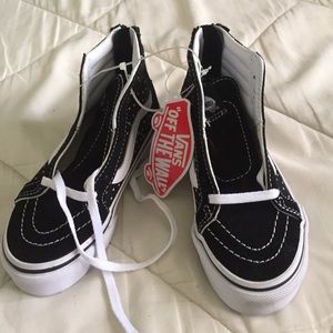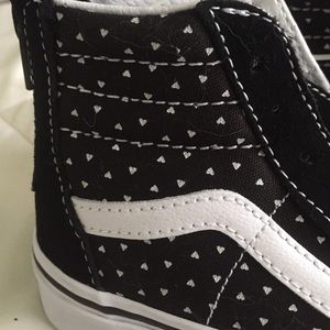 New black and white high top vans with hearts and zipper in the back.