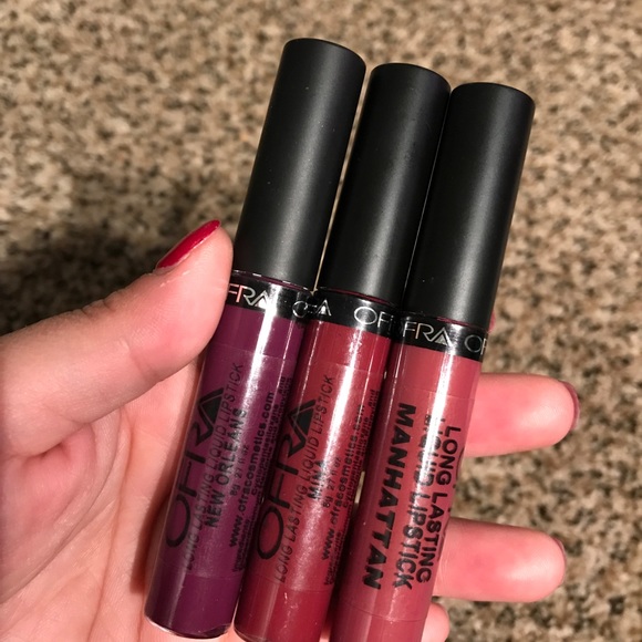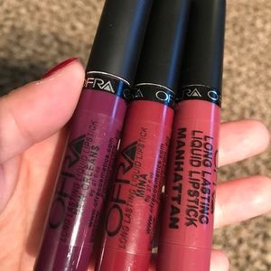 Ofra cosmetics liquid lipsticks in shades: New Orleans, manhattan, and Mina, used a couple times and I just have other shades I like better, these are more like mini sizes but way bigger than the kylie cosmetics mini set (just for size reference) #ofracosmetics #makeup #lipsticks