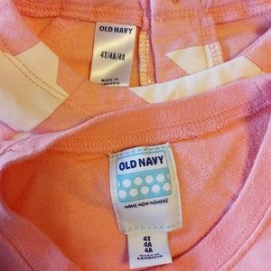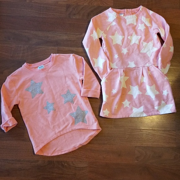 2 Old Navy girls 4t shirts. They are a light sweat shirt material. The one with white stars is long with pockets and cute with leggings and the one with silver stars has 3/4 sleeves. Both worn once or twice