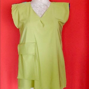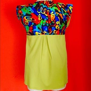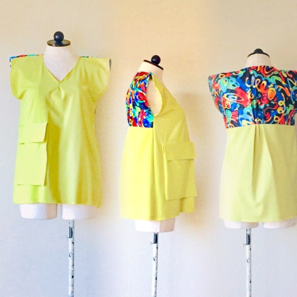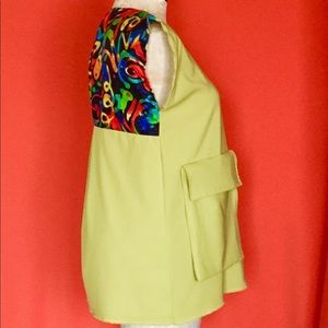 Custom made tunic perfect with dark denim jeans, stretch cotton woven, back multi color fabric is cotton-poly blend. Unique feature of oversized functional pocket. Slight mark on mid right in front of tunic ( see pic). Mesa. Armpit to armpit 21/