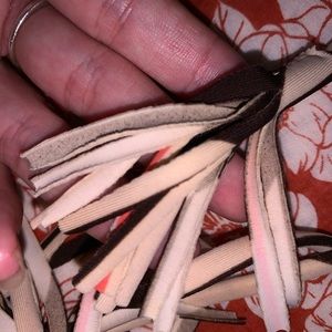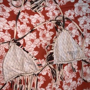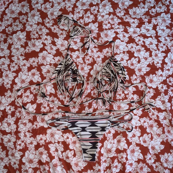 Top is Sz P (can fit bigger, I’m a 34C). Has some sand in the tassels (see last pic). No major flaws