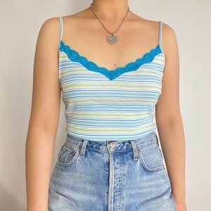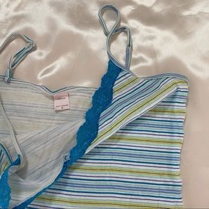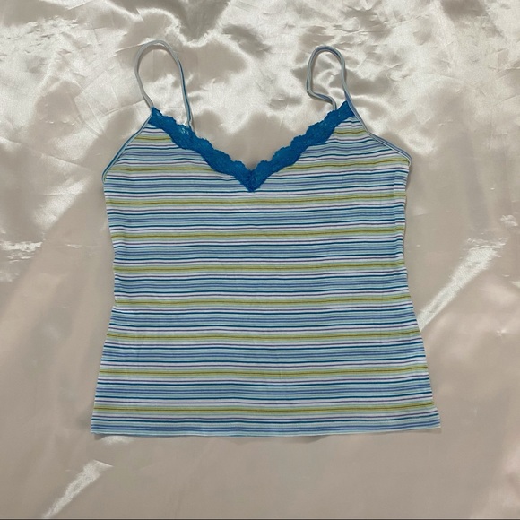 Victoria Secret lace trim tank top. Adorable cami top features blue white green striped color way, blue lacy trim along v neck, and adjustable straps. Super soft and comfy. Good preloved condition, no major flaws.