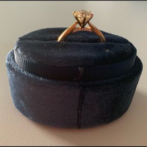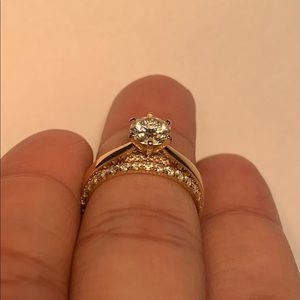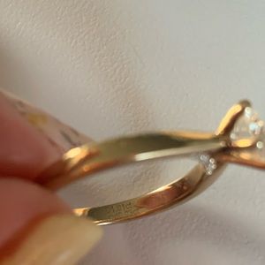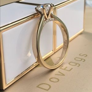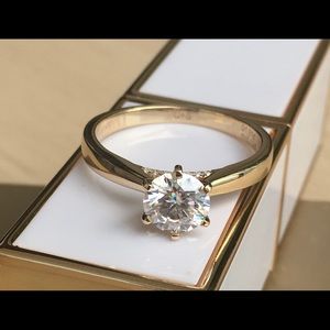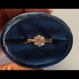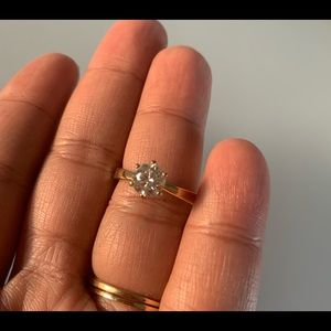 This is a stunning 1 ct equivalent crown arrows cut moissanite engagement ring, GHI color in solid heavy 14k gold. Purchased from DovEgg’s, has a lifetime warranty that can be transferred to purchaser. This ring does have engraving, which I have reflected in price. No bad juju, still happily married! Accent stones also authentic moissanite. Looks so diamond-like! This stone sparkles like crazy.