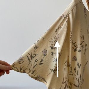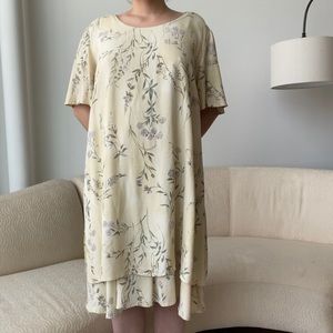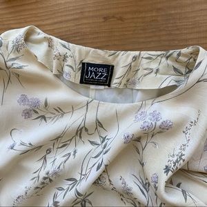 Vintage More Jazz muted-yellow floral print lined midi dress. lined scoop neck & layered flutter hem & flutter sleeves. boxy + relaxed silhouette.