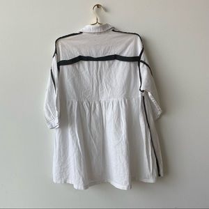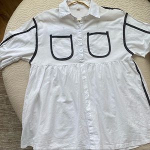 Today’s Fashion linen-blend boxy tunic in white with black-lined detailing. collar, button-down front, two bust pockets.
