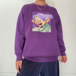 Vintage Disney Dopey the dwarf crewneck sweatshirt in purple ☂️ So comfy and cozy, made in the USA quality. Fleece lined inside. There's some pilings throughout and a couple of lil bleach marks shown in last photo. Overall in good vtg condition.
