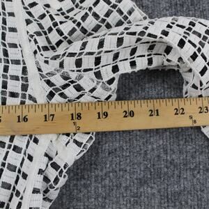 Design: Sheer grid lace/mesh overlay with contrast black trim and banded neckline