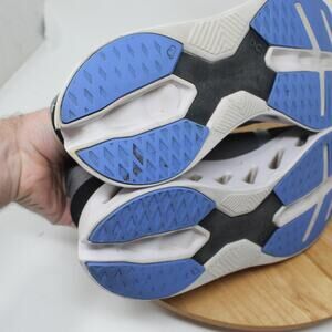 Color: Black and gray with blue accents; white midsole and blue rubber outsole