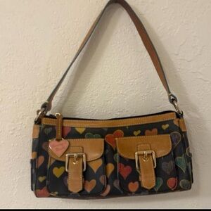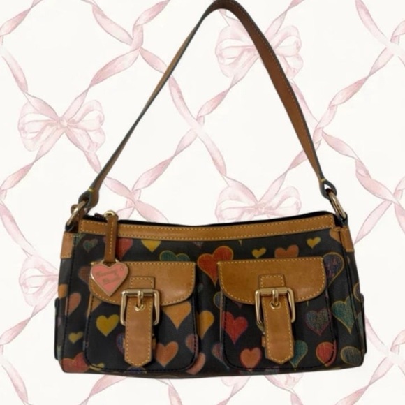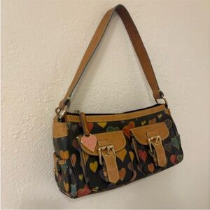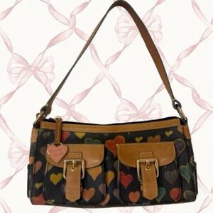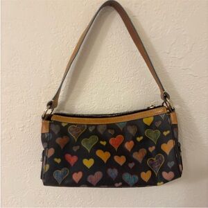 Vintage Y2K Dooney and Bourke Lindsay Lohan double pocket shoulder bag with the multi color heart patten in amazing condition inside and out