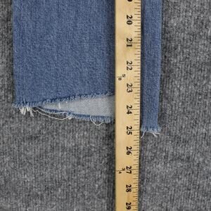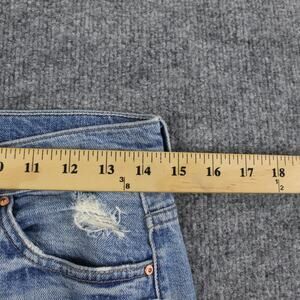 Pre-owned jeans with intentional heavy distressing at knees, thighs, pockets, and raw step-fray hems. Light general wash wear from normal use but no additional holes or stains beyond the designed distressing. Zipper and button closure are functional.