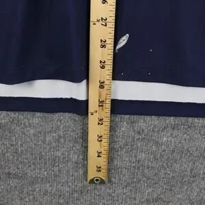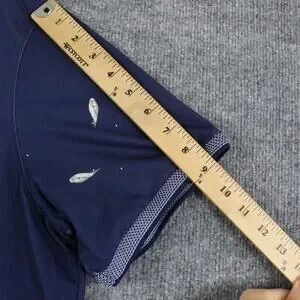 Color: Navy blue with small allover fish-style graphic print, mint green inner neck trim, and white under-hem detail.