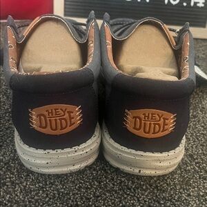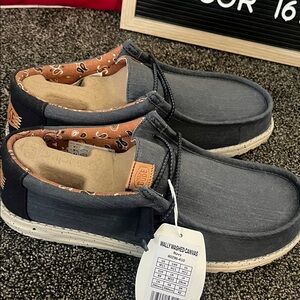 Comfortable blue and gray slip-ons by Hey Dude. Ideal for casual outings.