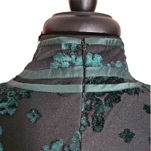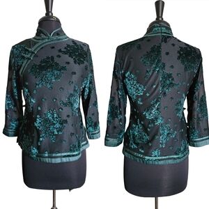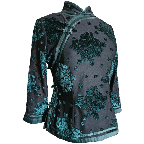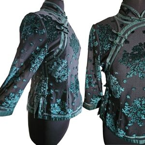 Qipao/cheongsam blouse with flocked velvet florals. 3/4 Sleeves and zips at back. No brand/tag, but fits medium best. please see measurements below.