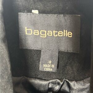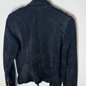 bagatelle black suede moto jacket. Accents are jewelry grade silver hardware with heavy duty zips and the jacket is lined. Equip with zipper cuffs for fit. Excellent condition, Size 38.
