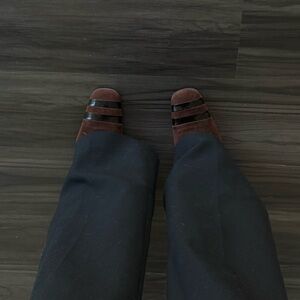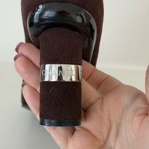 Authentic Chanel heels. Size 37.5. Has the coolest detail on the heel with the Chanel logo spelled out on the silver hardware. Brown suede with leather accents. Heel is approx 3”