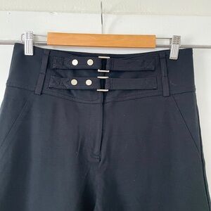 High-waist wide leg pants. Double buckle detail at the waistband. Sleek black fabric. Versatile and timeless style.