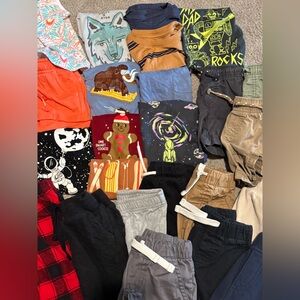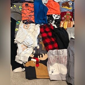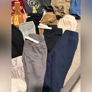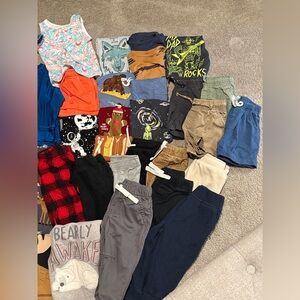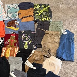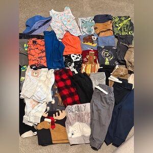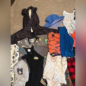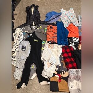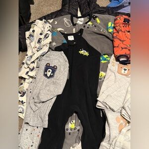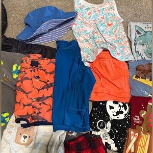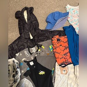 A variety of baby clothes including shirts, pants, shorts, and pjs. Swim trunk + beach longsleeve + sunhat